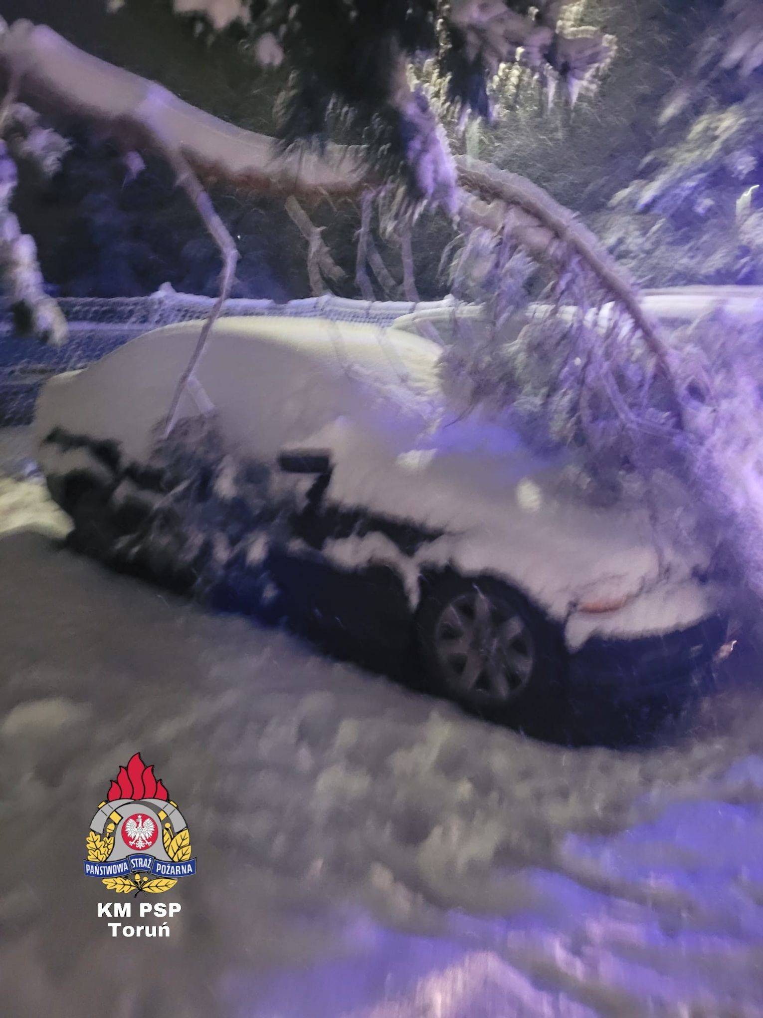 Samochód, na który spadł konar, został poważnie uszkodzony, co pokazuje siłę, z jaką drzewo uderzyło w pojazd.