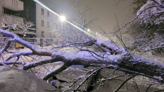 Oberwane konary drzew: Gałęzie, nie wytrzymując ciężaru mokrego śniegu, łamały się i spadały na drogi, chodniki i linie energetyczne.
