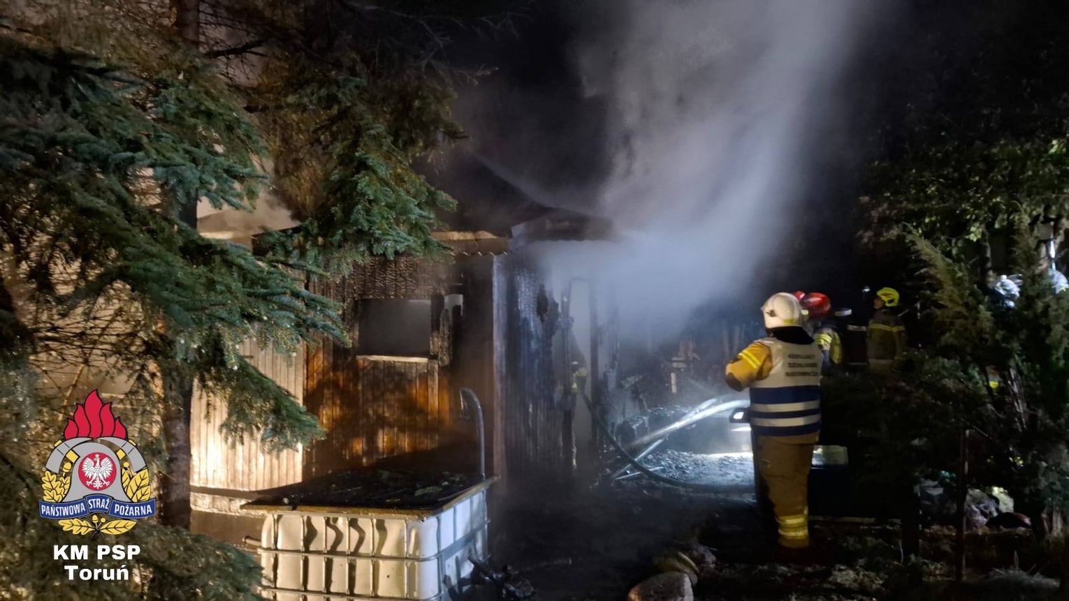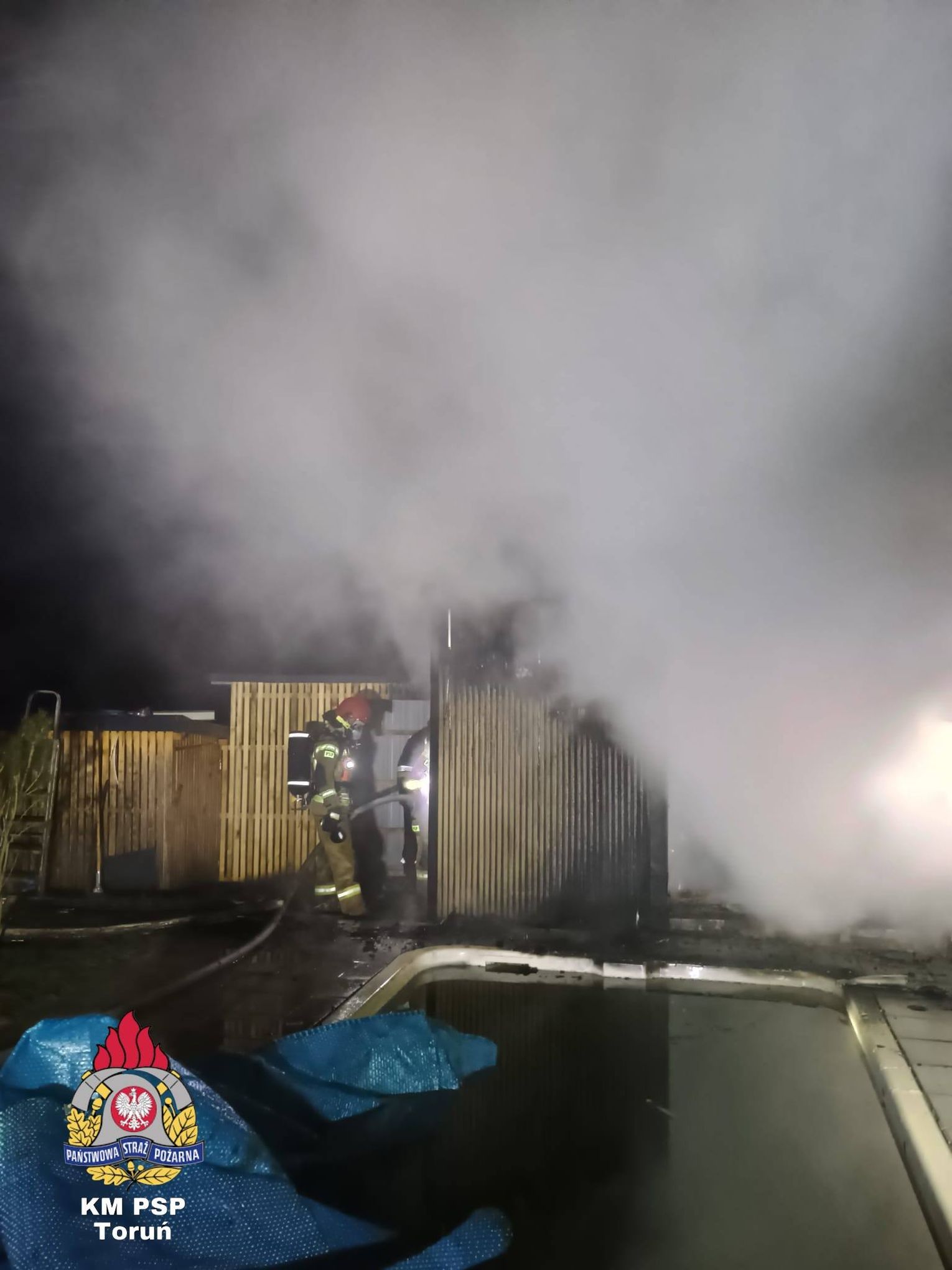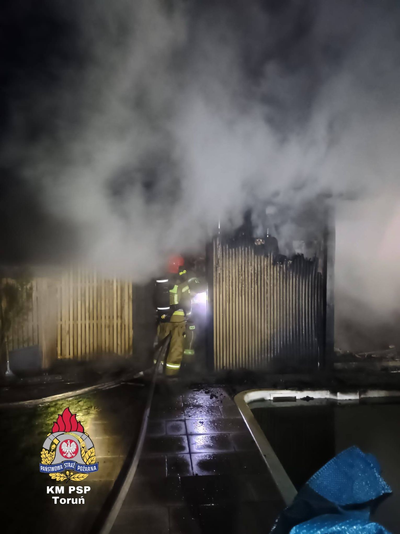 Tym razem scenariusz był jeszcze groźniejszy. Ogień nie trawił wolnostojącej konstrukcji na zewnątrz, lecz uderzył w saunę znajdującą się wewnątrz budynku gospodarczego. Skala zagrożenia była ogromna. Do walki z żywiołem rzucono potężne siły – aż 7 zastępów straży pożarnej. Syreny wozów z JRG nr 3, Lubicza, Gronowa, Rogówka, Rogowa, Młyńca Pierwszego i Grębocina przecinały świąteczną ciszę, niosąc ratunek tam, gdzie ogień próbował odebrać świąteczny spokój.